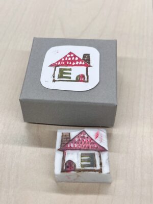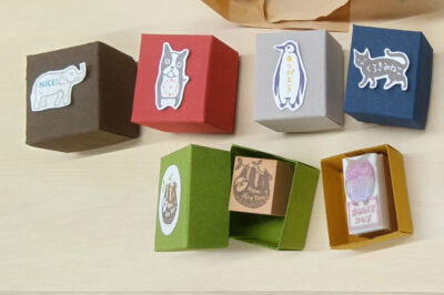 作ったはんこは木の持ち手をつけて、お好きな色の箱に入れてお持ち帰り♥