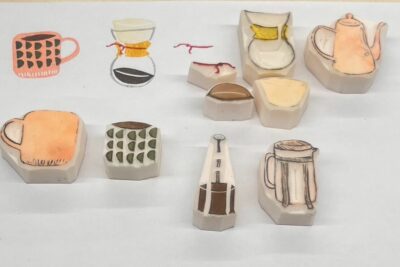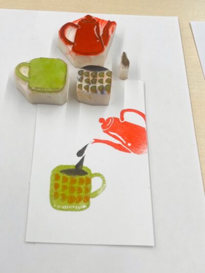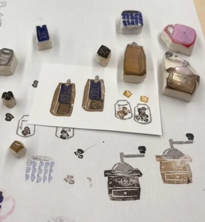 2023年最初の回は、紙コップと布製カップスリーブに彫ったはんこを捺しました。