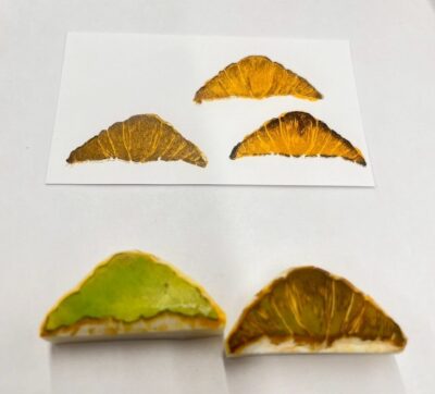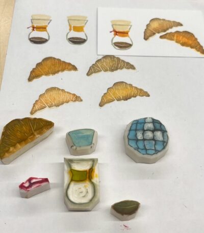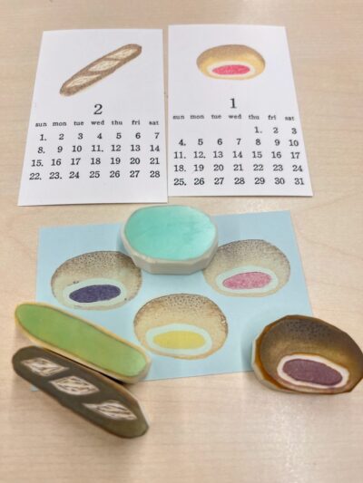 今回は来年2023年のミニカレンダーに楽器・お菓子のはんこを彫って捺しました。