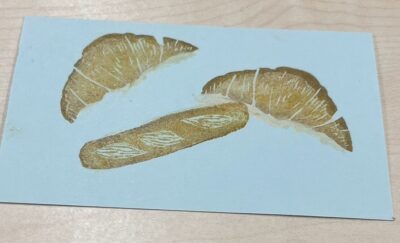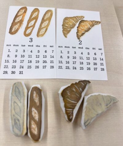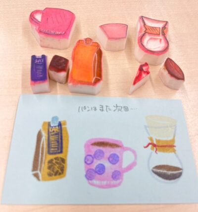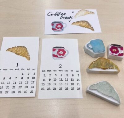 今回は「パン」と「コーヒー」のはんこを彫って名刺サイズのカレンダーカードに捺しました!