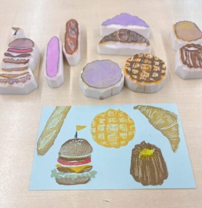 今回は、ハガキサイズのカレンダーカードに日本の食べ物はんこを彫って捺しました。