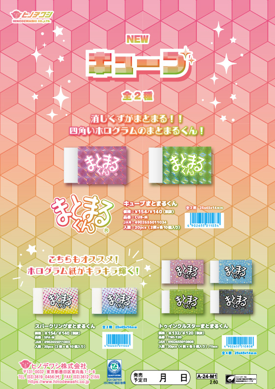 NEWS新着情報 HOME > NEWS PRODUCT 2024.01/12 「キューブまとまるくん」2024年1月下旬発売✨ 消しくずがまとまる! キューブが重なるキラキラホログラム✨✨ ●キューブまとまるくん 品 番:CUB-M 価 格:¥154/¥140(税抜き) 入 数:20pcs(2柄各10個入り) J A N :4902655011034