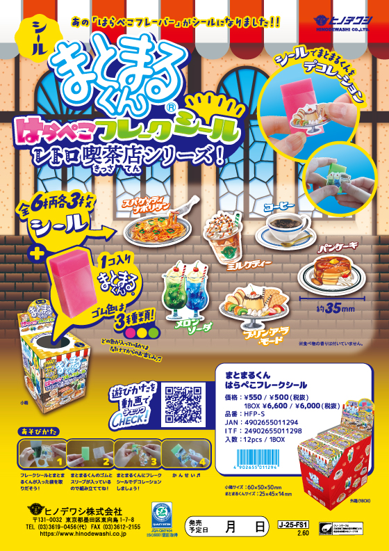 NEWS新着情報 HOME > NEWS PRODUCT 2025.10/02 「はらぺこフレークシール」2025年10月下旬発売予定! あの はらぺこフレーバーシリーズ が フレークシールになりました~~🎊🎊🎊 フレークシールが6デザイン各3枚ずつと、スリーブが透明のまとまるくん1コ入り! まとまるくんをシールでデコレーションしちゃおう🪄 くわしい遊びかたは動画をチェックしてね👀👆 ●まとまるくんはらぺこフレークシール 品 番:HFP-S 本体価格:¥550 / ¥500(税抜) 1BOX ¥6,600 / ¥6,000(税抜) 入 数:12pcs / 1BOX J A N:4902655011294